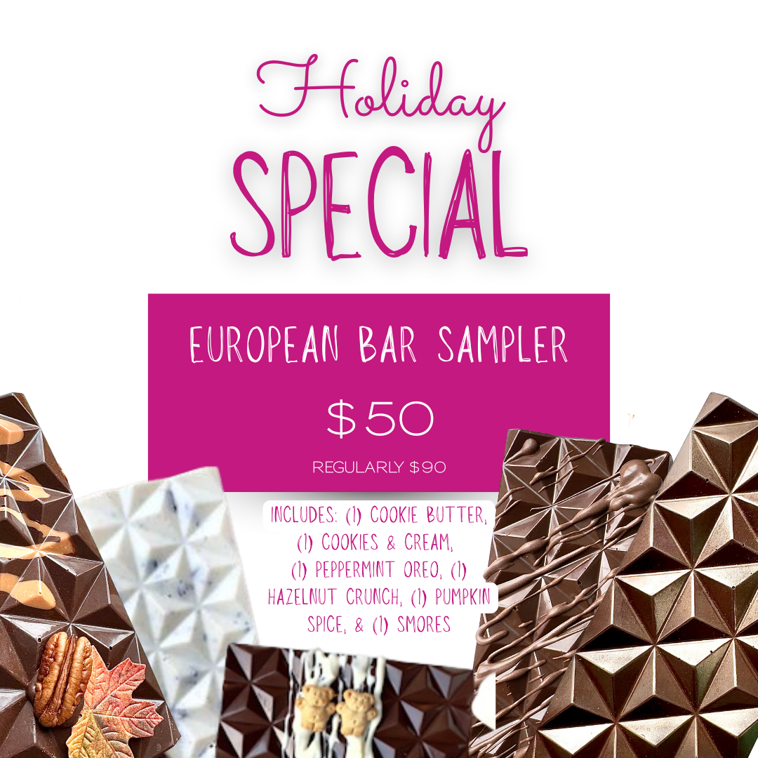 Enjoy six of our most popular small-batch European bars. Each package includes (1) Cookie Butter, (1) Cookies & Cream, (1) Peppermint Oreo, (1) Hazelnut Crunch, (1) Pumpkin Spice, & (1) Smores bar.